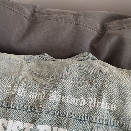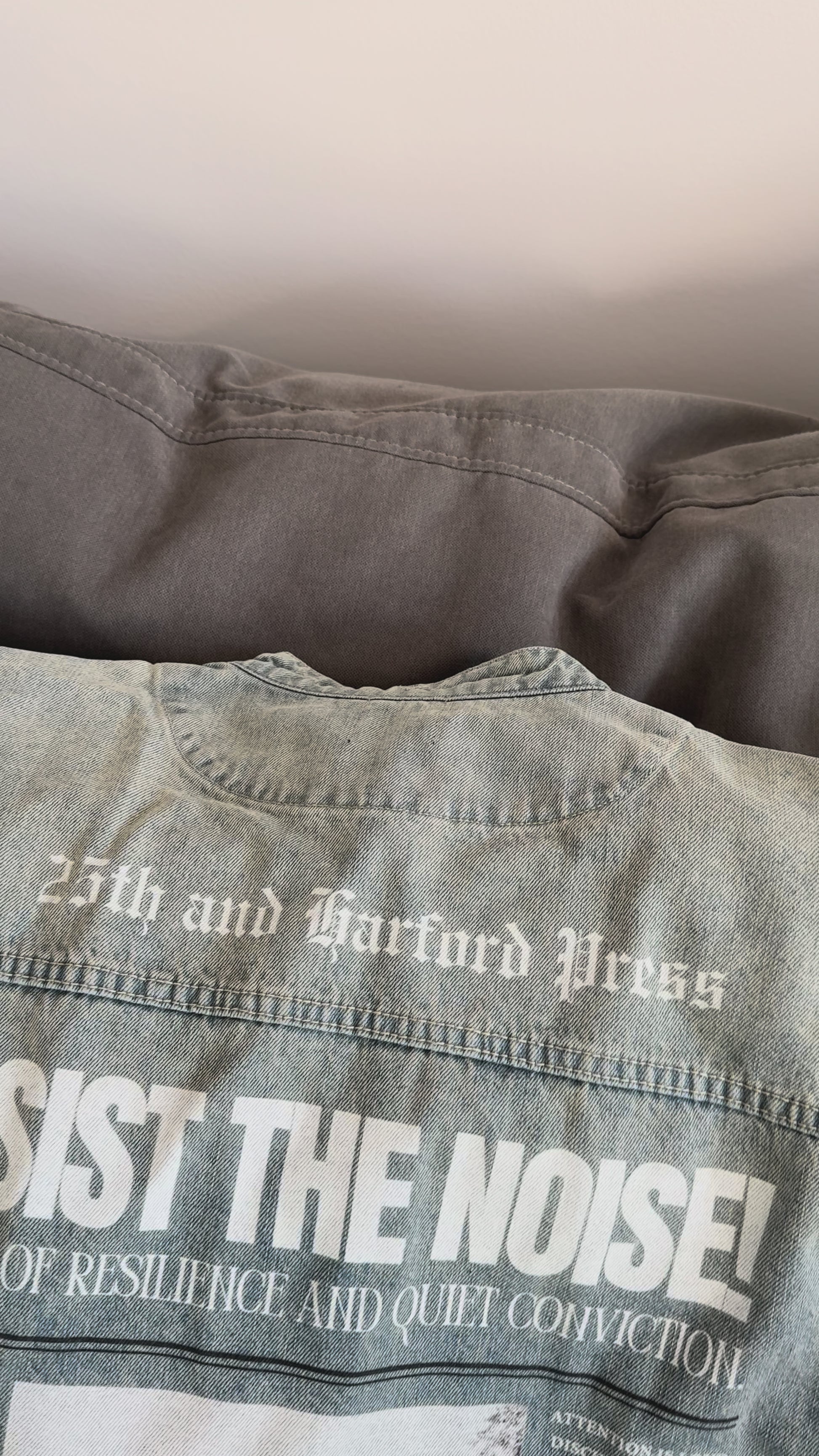 Built on classic denim and finished with a full back newspaper print, Resist the Noise captures the tension between distraction and discipline, attention and intention. The distorted image—pulled from a real place, held in memory—remains deliberately unresolved. It doesn’t explain itself. It doesn’t need to.